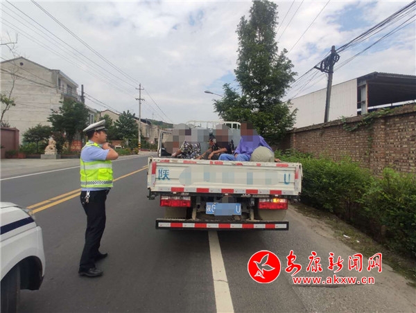 7月31日15時許,大隊執(zhí)勤民警在316國道沿線開展路面巡邏,行至恒口東大門時,發(fā)現(xiàn)一輛號牌為皖A(yù)C***C號輕型欄板貨車后車廂有違規(guī)載人嫌疑,巡邏民警立即上前攔停,示意駕駛?cè)死钅衬惩\嚱邮軝z查。經(jīng)查,該貨車核定載人數(shù)為5人,實際載9人,貨車車廂違法載客4人,屬于貨車違法載客的嚴重交通違法行為。