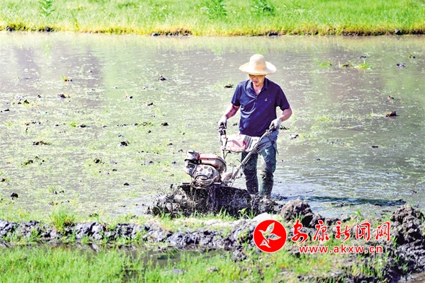 5月1日,石泉縣城關(guān)鎮(zhèn)絲銀壩村百畝水田里,農(nóng)戶操作旋耕機(jī)做好插秧前的各項準(zhǔn)備工作。董長松 攝