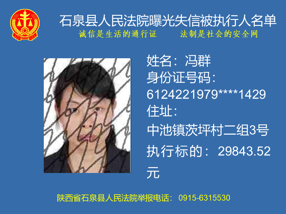 為了進一步加大執(zhí)行力度,保障勝訴當(dāng)事人的合法權(quán)益,推進社會誠信體系建設(shè),依照《中華人民共和國民事訴訟法》、《最高人民法院關(guān)于公布失信被執(zhí)行人名單信息的若干規(guī)定》等法律、司法解釋的有關(guān)規(guī)定,現(xiàn)對一批已進入執(zhí)行程序,且尚未全部履行義務(wù)的被執(zhí)行人進行媒體曝光,歡迎廣大群眾支持石泉縣人民法院的工作,向我院提供被執(zhí)行人的財產(chǎn)線索,使生效法律文書能夠得到切實執(zhí)行,讓人民群眾切實感受到公平正義就在身邊。