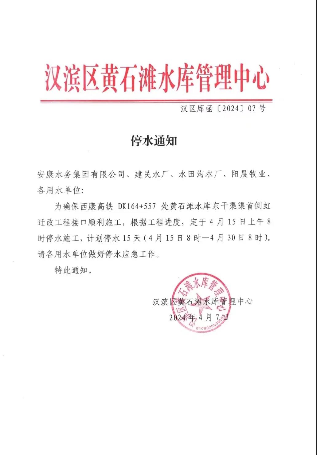 本網(wǎng)訊 4月12日,安康水務(wù)集團(tuán)有限公司供水分公司發(fā)布停水通知:因西康高鐵DK164+557處與黃石灘水庫東干渠渠首倒虹豎井正交,需對東干渠倒虹進(jìn)行遷改。根據(jù)遷改工程進(jìn)度和供水接口轉(zhuǎn)換施工需要,將于4月15日上午8時(shí)起對黃石灘水庫干渠進(jìn)行停水施工(工期15天)。