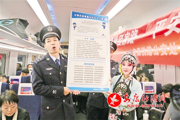1月14日,由西安開(kāi)往達(dá)州的D173次列車(chē)上,西安鐵路公安局安康公安處聯(lián)合漢濱區(qū)文化館、安康漢調(diào)二黃研究院的文藝工作者,以地方非物質(zhì)文化遺產(chǎn)技藝展示等方式,結(jié)合春運(yùn)開(kāi)展反詐知識(shí)宣講,讓旅客們?cè)诖哼\(yùn)旅途中感受安康地方傳統(tǒng)文化獨(dú)特魅力,提升安全意識(shí)。