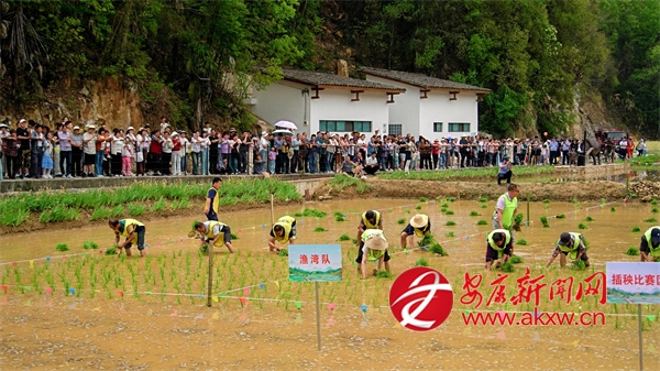 10點50分,插秧比賽正式開始,只見寨溝村、龍泉村、漁灣村、湯坪村四支隊伍在水田中依次排開。 隨著清脆的哨響,四支插秧隊伍迅速進入狀態(tài),水田瞬間化作激烈的賽場。彎腰俯身,左手攥緊秧苗,右手分秧、插秧,一株株嫩綠的秧苗被精準插入田中,泥水飛濺間,選手們你追我趕,汗水與歡笑交織,將傳統(tǒng)農(nóng)事活動演繹成了一場精彩絕倫的視覺盛宴。