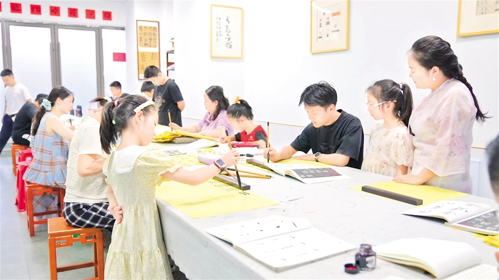 “我們來看下這‘?!?,是左右結(jié)構(gòu)的字,左邊的偏旁是一個(gè)三點(diǎn)水,三點(diǎn)水寫的時(shí)候要注意連貫性……”書法老師細(xì)致地拆解著漢字的書寫技巧,耐心指導(dǎo)著現(xiàn)場(chǎng)的每一位學(xué)員。