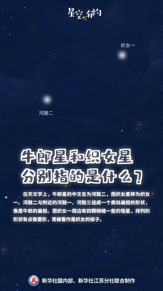 中國科學(xué)院紫金山天文臺科普主管王科超說,在天文學(xué)上,代表牛郎、織女的天體分別是牛郎星和織女星。牛郎星的中文名為河鼓二,織女星為織女一,它們分別是天鷹座和天琴座的亮星。河鼓二與附近的河鼓一、河鼓三組成一個類似扁擔(dān)的形狀,像是牛郎的扁擔(dān)。而織女一周邊有四顆稍暗一些的恒星,排列的形狀有點像菱形,常被看作是織女的梭子。
