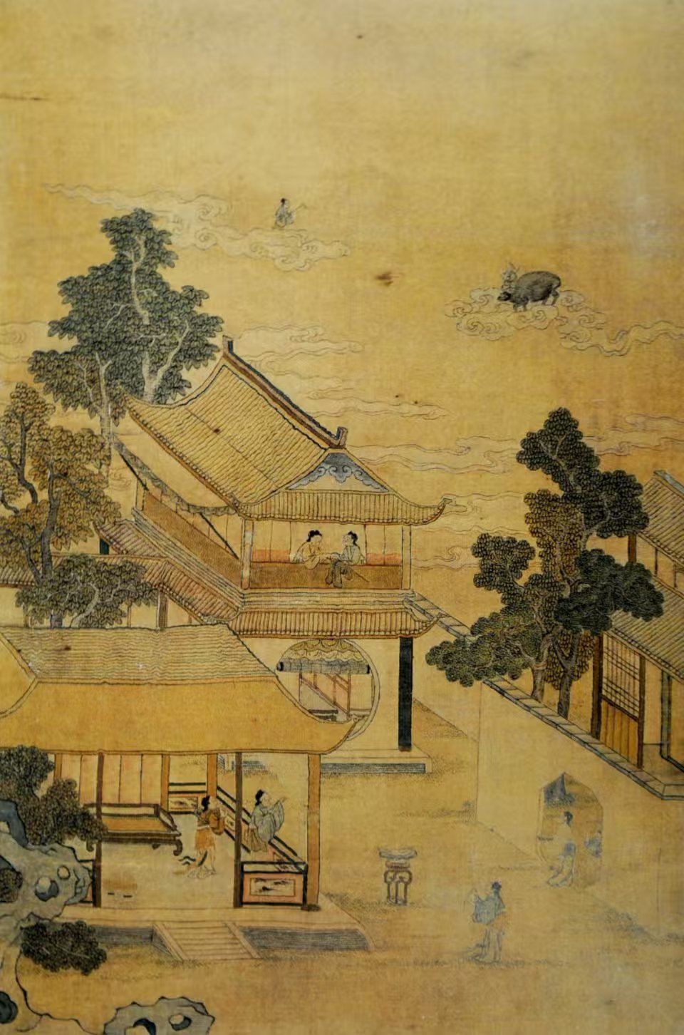 北京故宮博物院收藏的清代緙絲七夕乞巧圖軸,將天上和人間完美融合:上半部分是天上,牛郎織女在祥云圍繞下相會,眼神中充滿了深情和眷戀;下半部分是人間,幾位婦女或憑欄遠眺,或對空乞巧,一派和諧景象。這幅圖軸以緙絲工藝展現(xiàn),色彩豐富、線條細膩,不僅展現(xiàn)了古人高超的技藝,也反映了當時社會對七夕節(jié)的重視和人民對美好生活的向往。