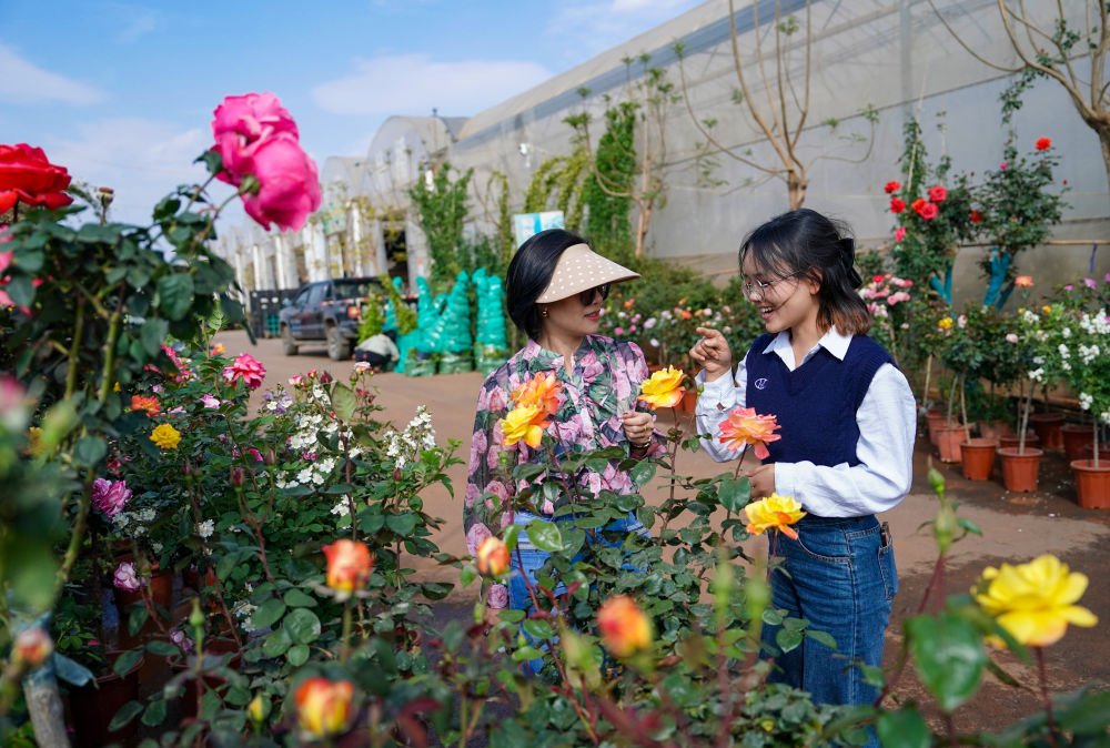 2025年4月11日,越南花商阮翠云(左)與翻譯李青歌在云南昆明斗南一花卉基地內查看鮮花品質。2018年,阮翠云開始在越南銷售云南花卉,讓七彩“云花”成為眾多越南家庭的“??汀薄=柚咝У碾娚唐脚_和快捷的物流網絡,鮮花從云南花田到河內貨架實現(xiàn)了“次日達”。